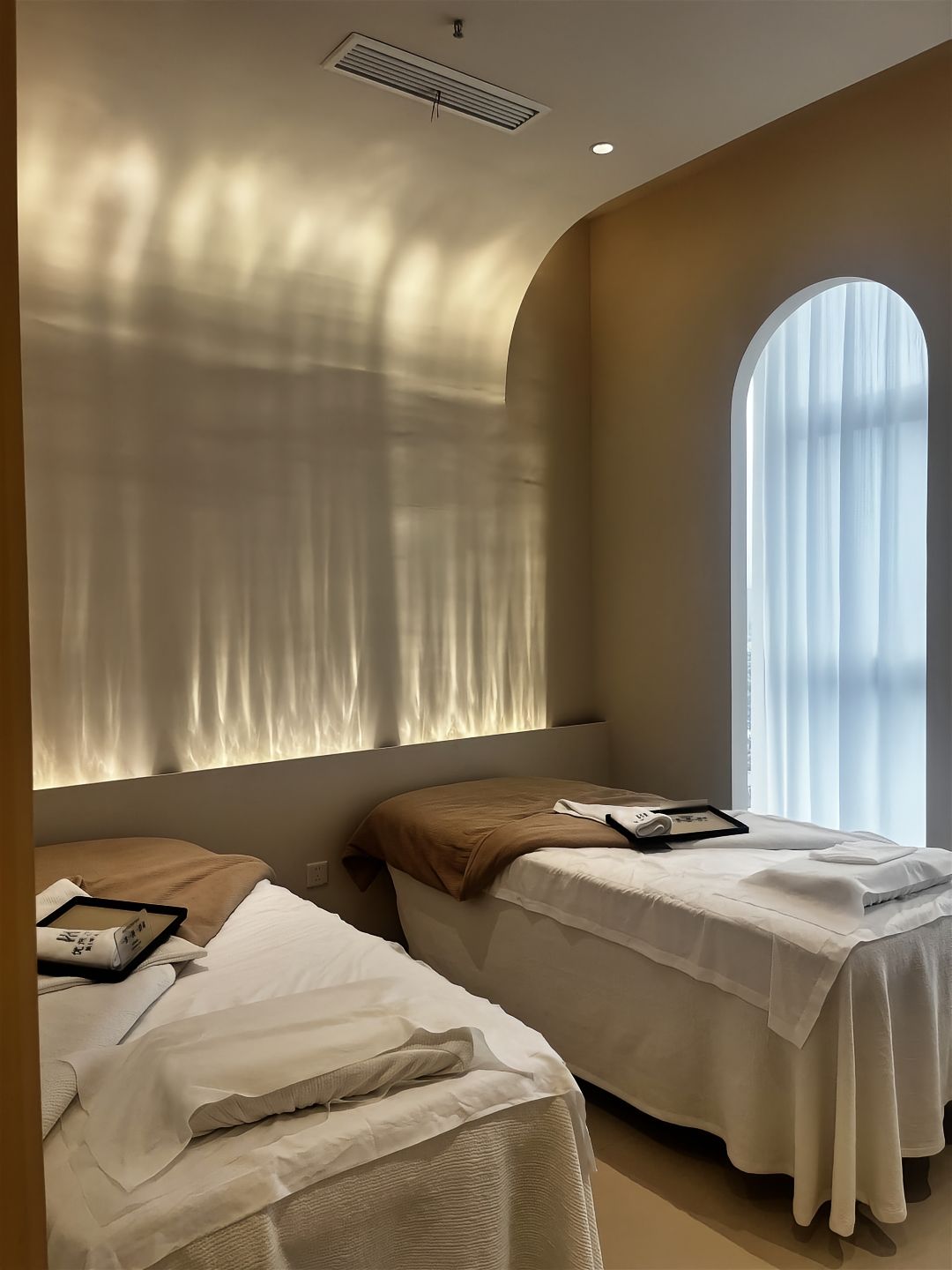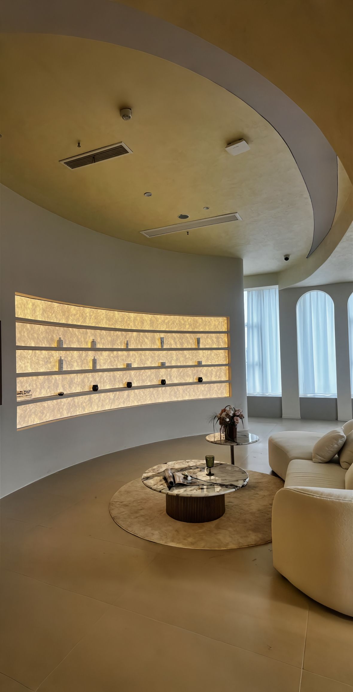 入口处通过内凹弧形墙体增强视觉吸引力,内部划分皮肤检测区、护理室及休闲功能区。护理室采用悬浮吊顶与隐藏灯带,避免直射光线干扰顾客体验。二楼增设化妆区与壁龛饰品展架,兼顾实用性与美学细节。